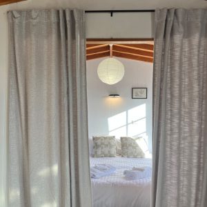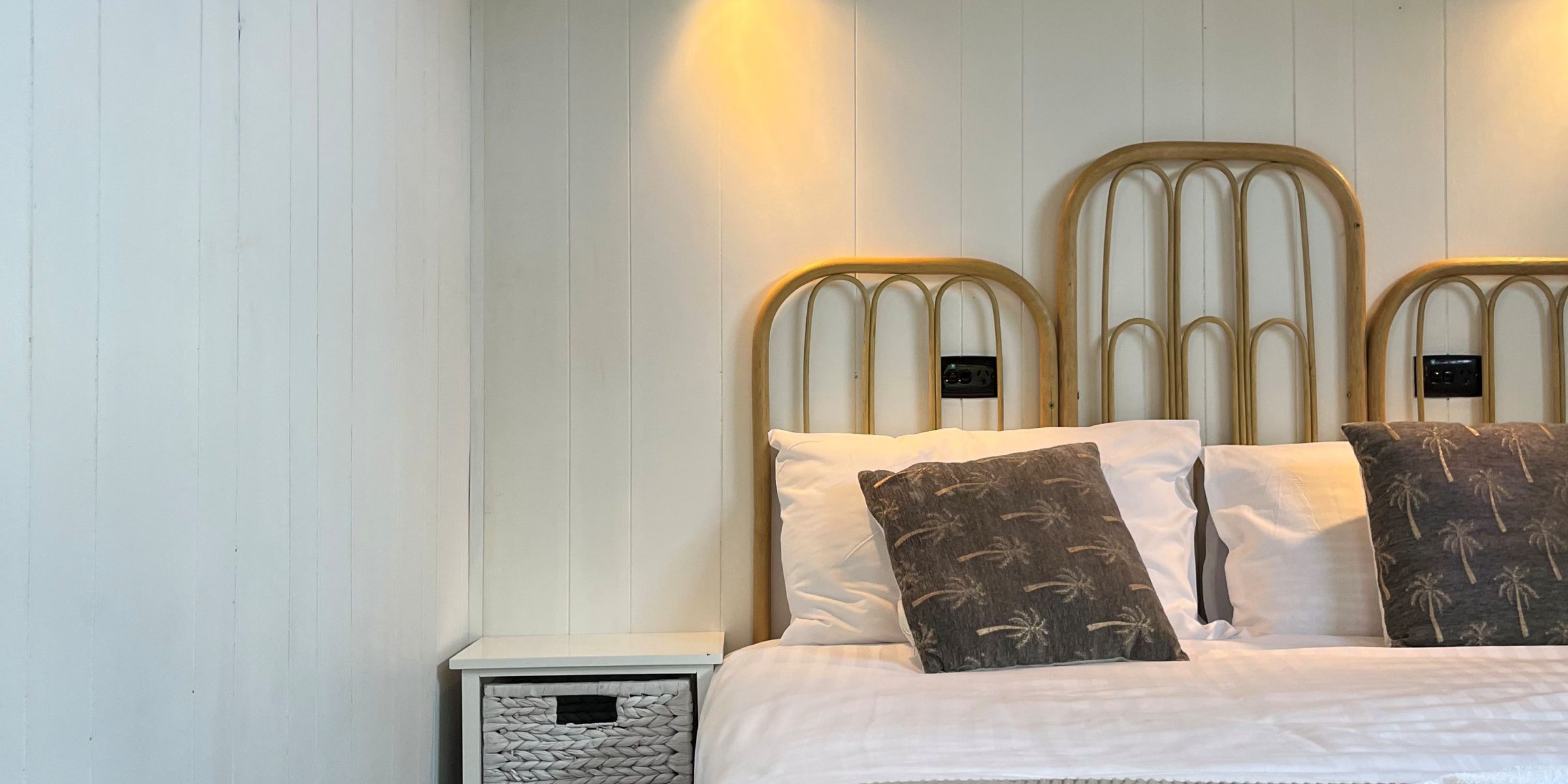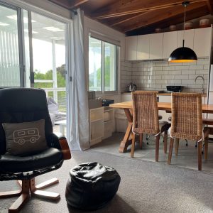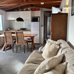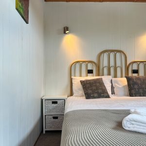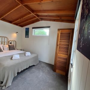 This cosy holiday cabin comfortably sleeps up to 4 guests, with two queen beds across separate bedrooms. One of the bedrooms is sectioned off from the living room.