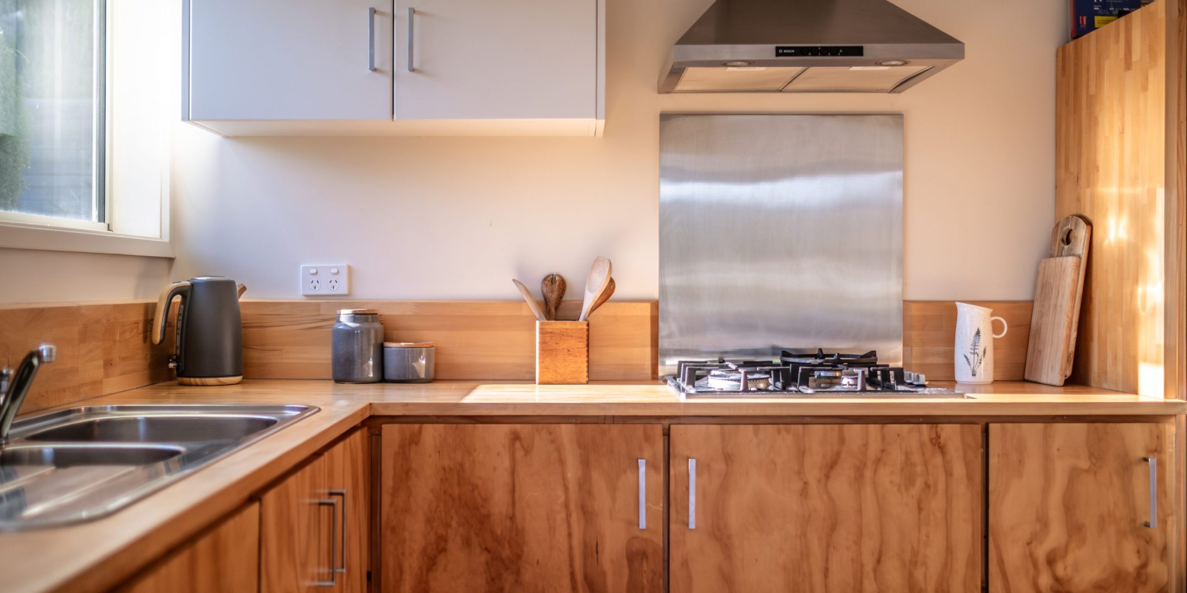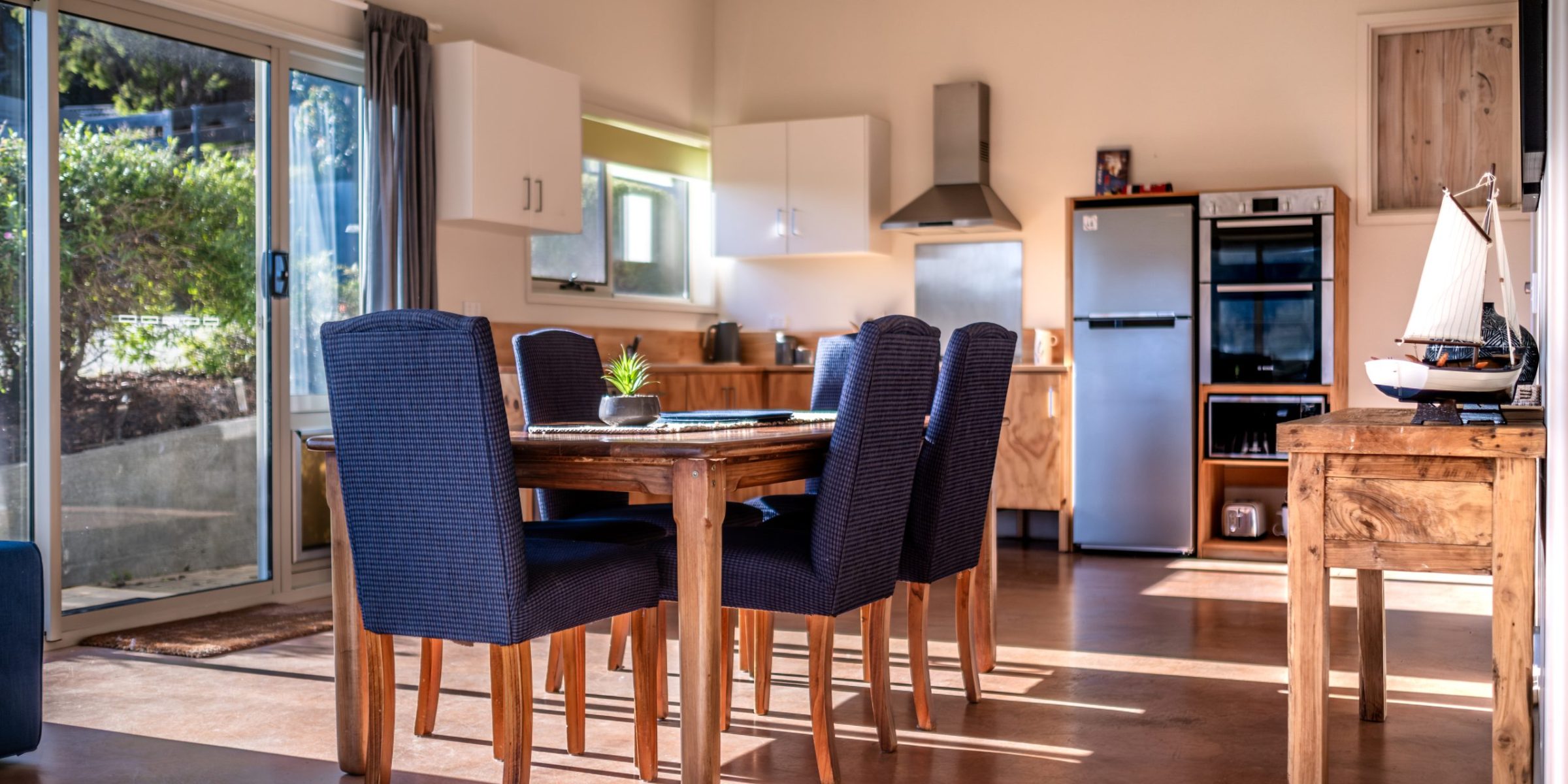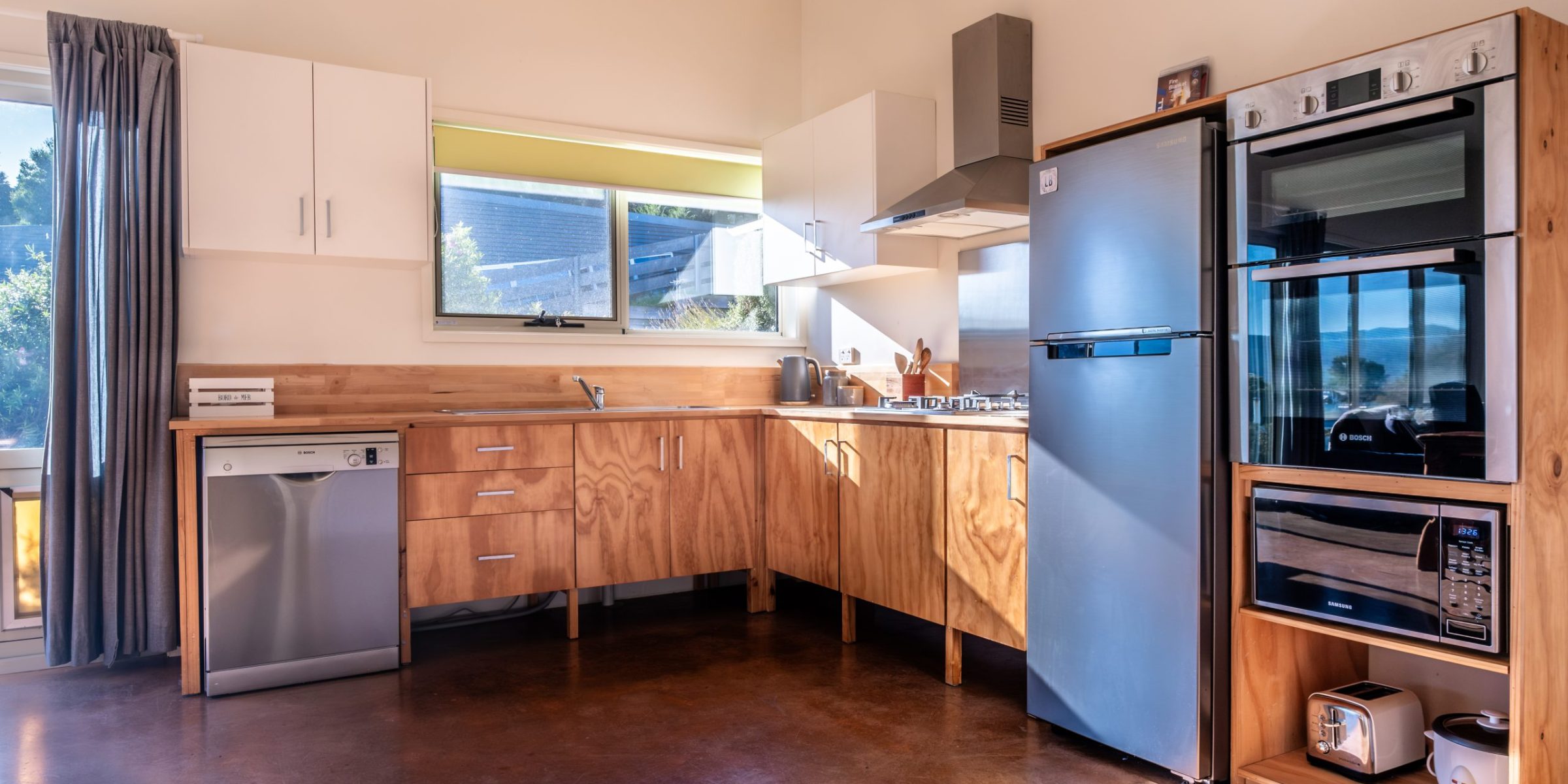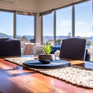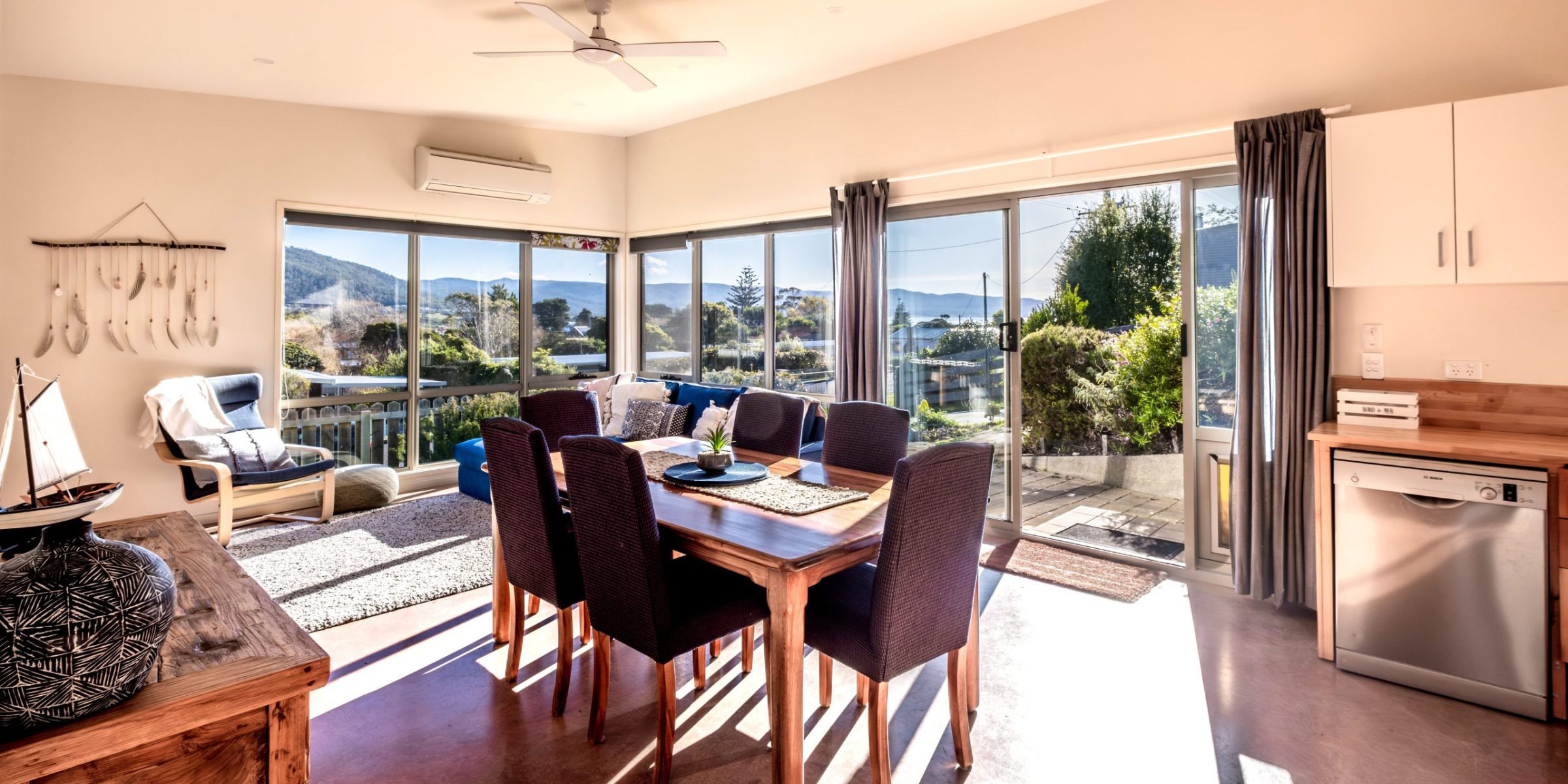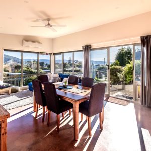 The kitchen is perfectly equipped with all modern cooking equipment and flows into a large open plan living room that enjoys all day sun and views of Waubs Bay and Bicheno surrounds.