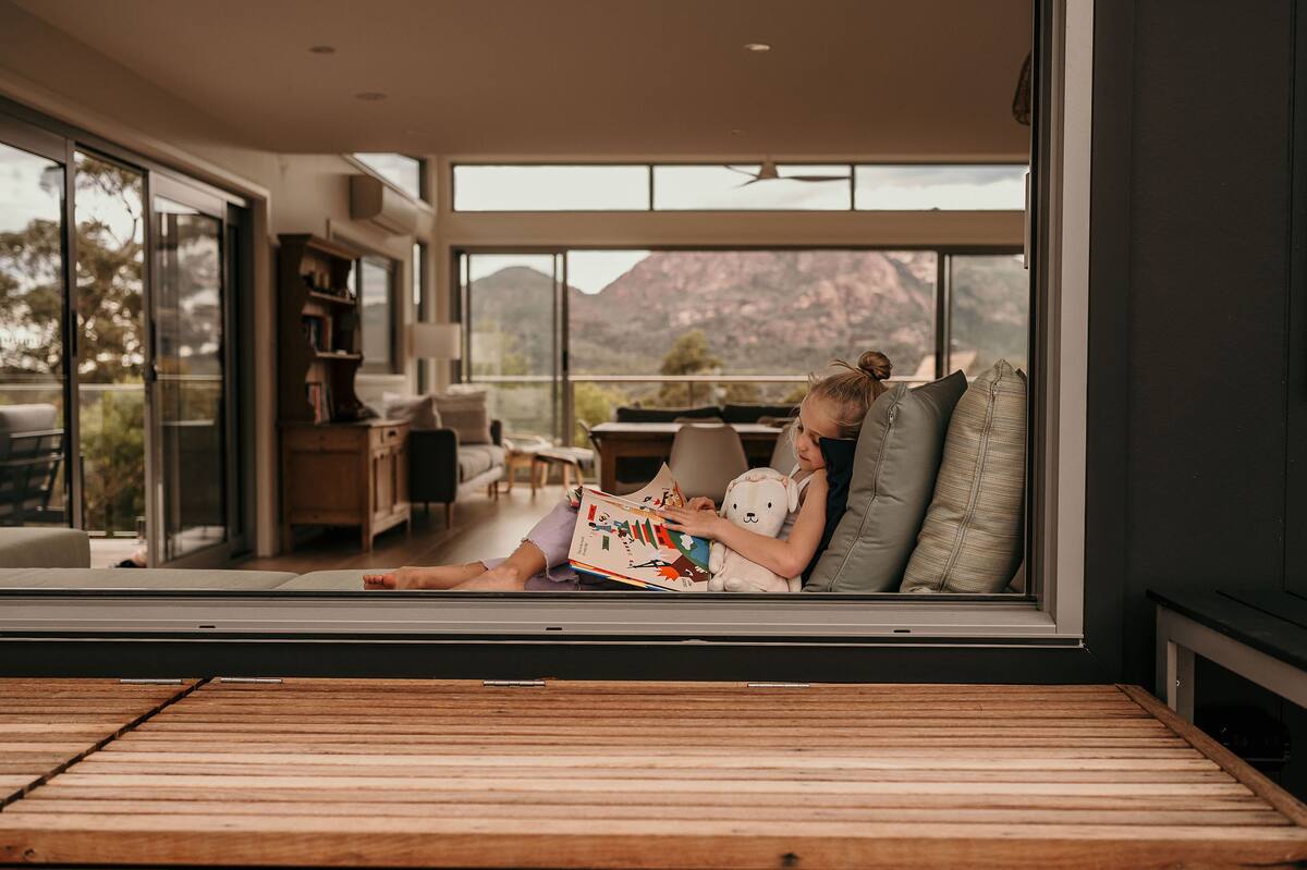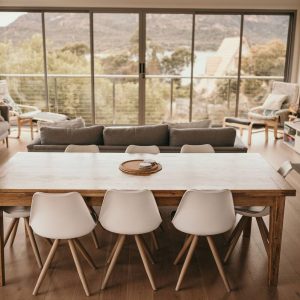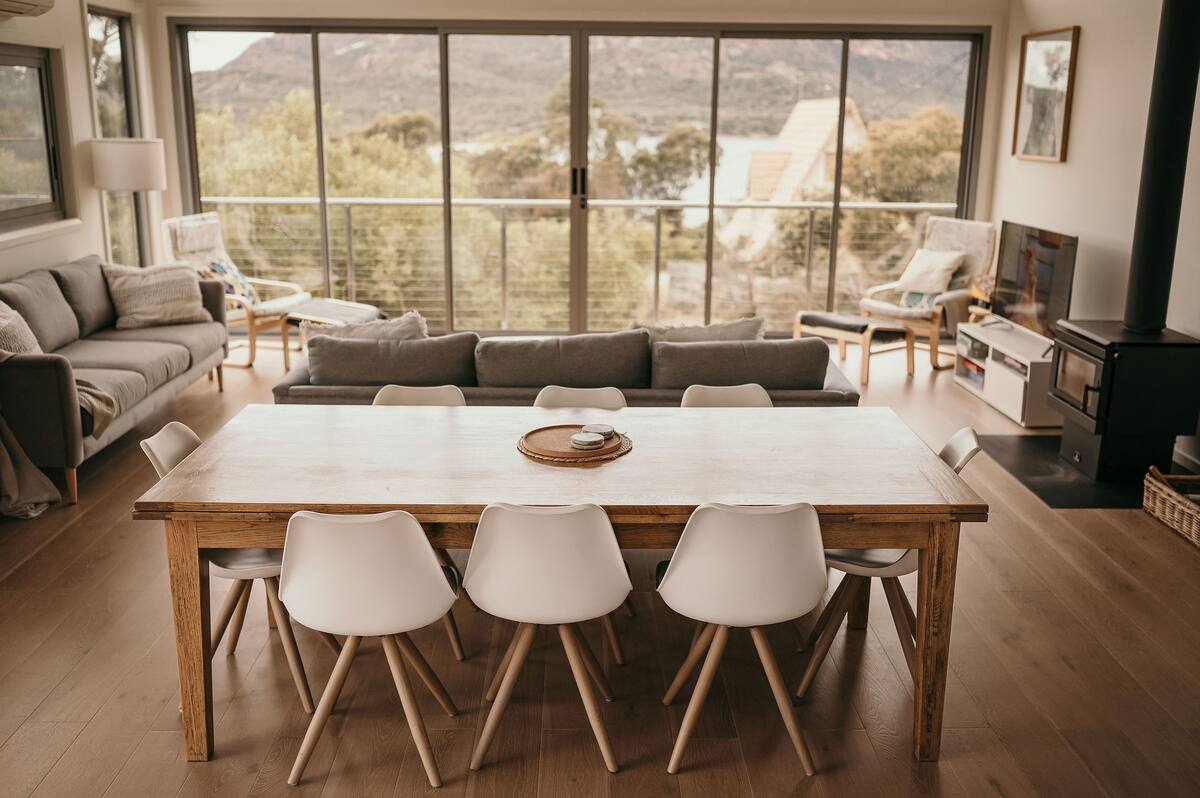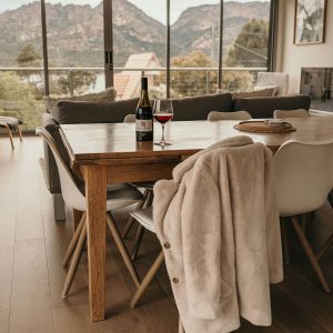 Located in the heart of Coles Bay and right on the edge of Freycinet National Park, The Tides offers stunning views across Coles Bay and the famous Hazard Mountains at the front of the house, with huge picture windows to highlight this view. The outlook to the east is just as spectacular, with unimpeded views across the national park. The large deck wraps around to make the most of all aspects, with outdoor lounges and window seats to guarantee cosy places to soak up the sun all day.