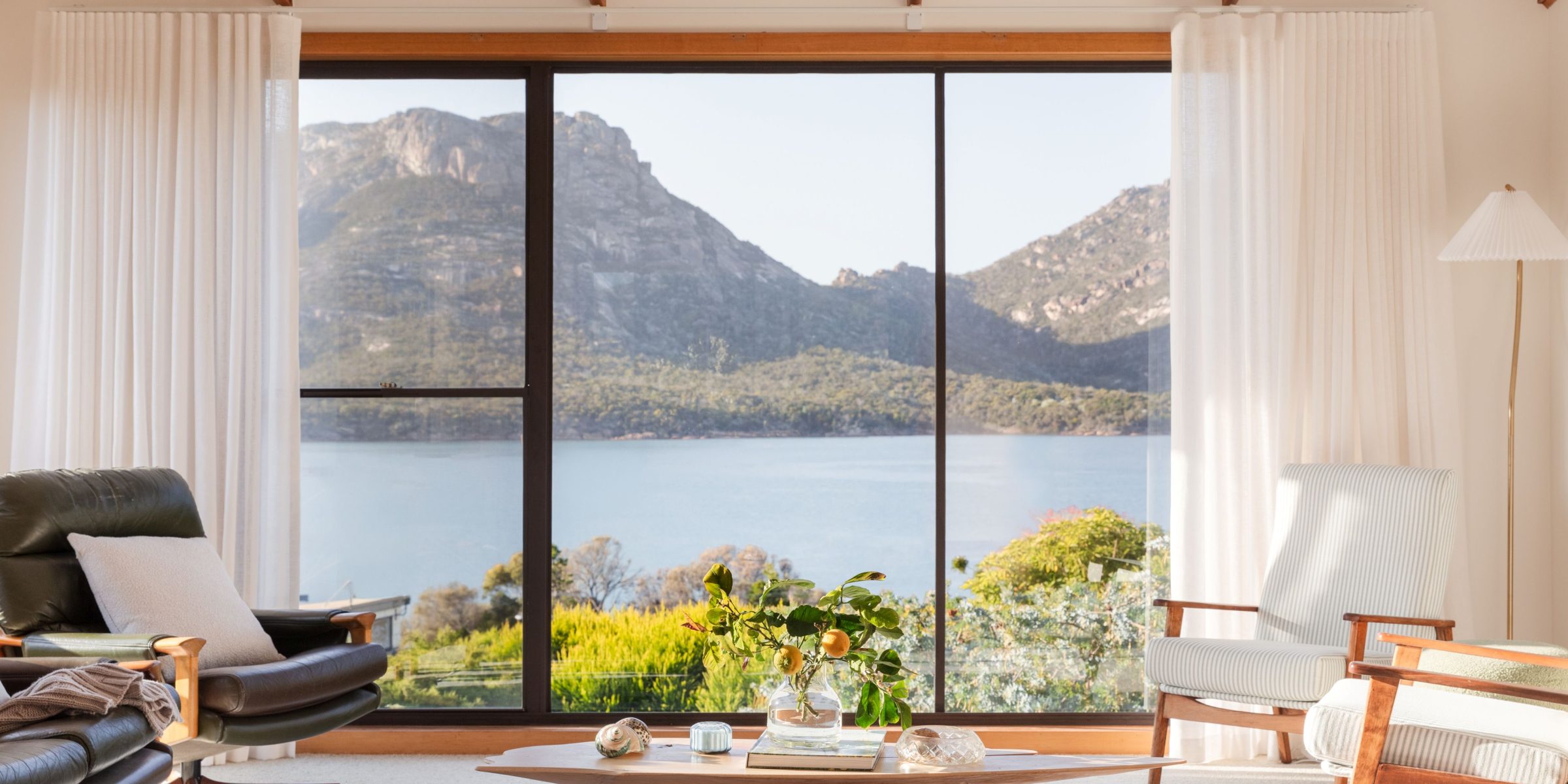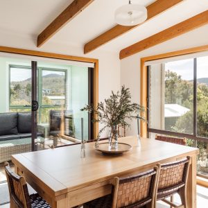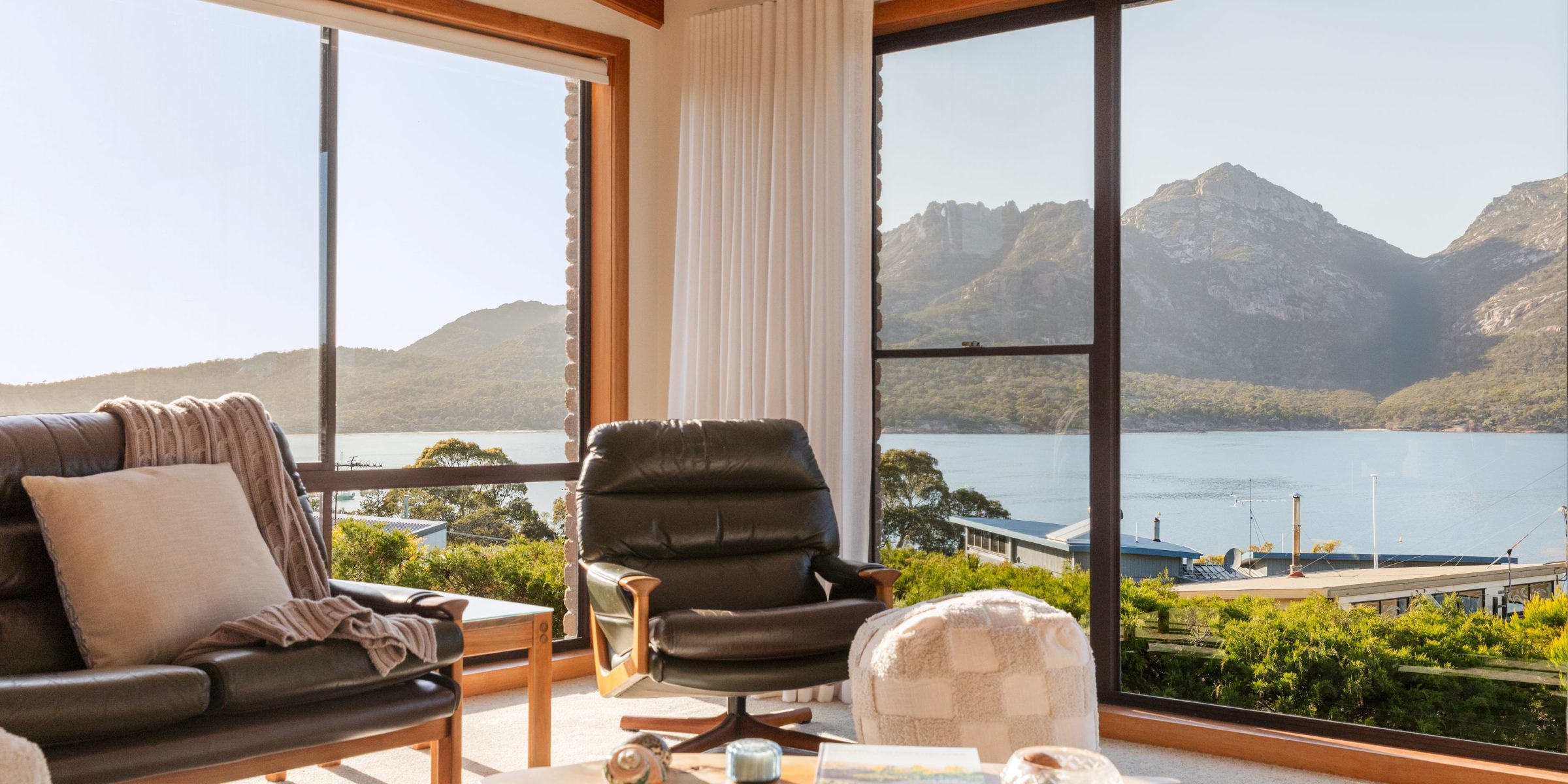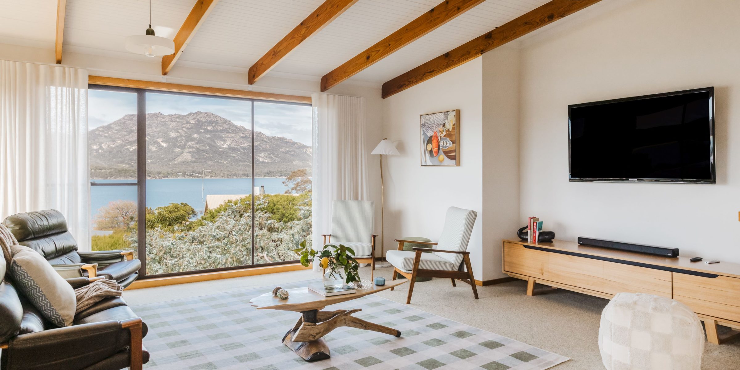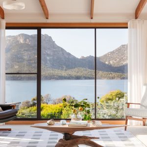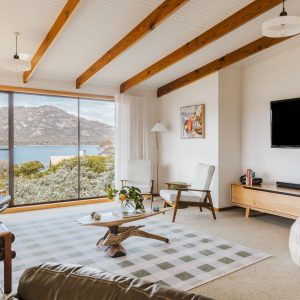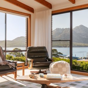 The open plan design of the kitchen flows into the lounge space where you could sit for days enjoying views of the ever-changing Hazard Mountains and Great Oyster Bay.
