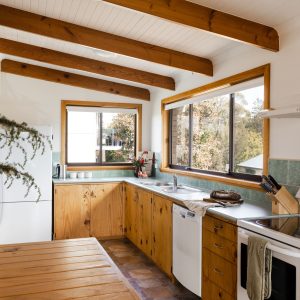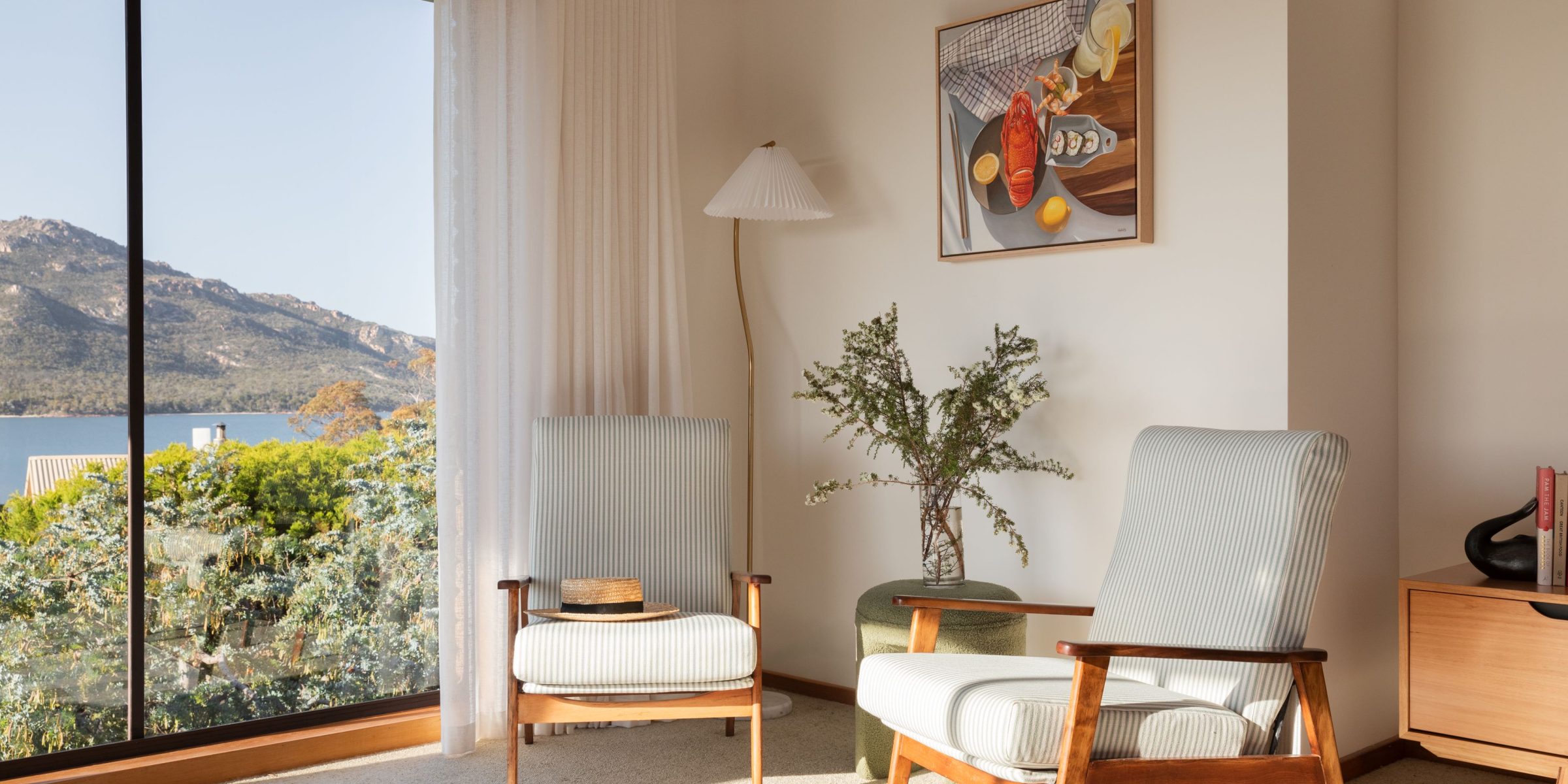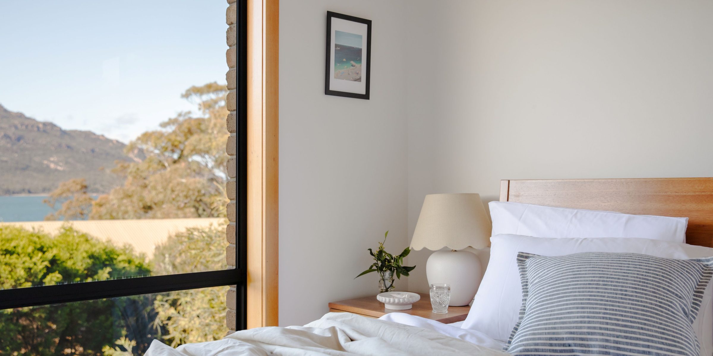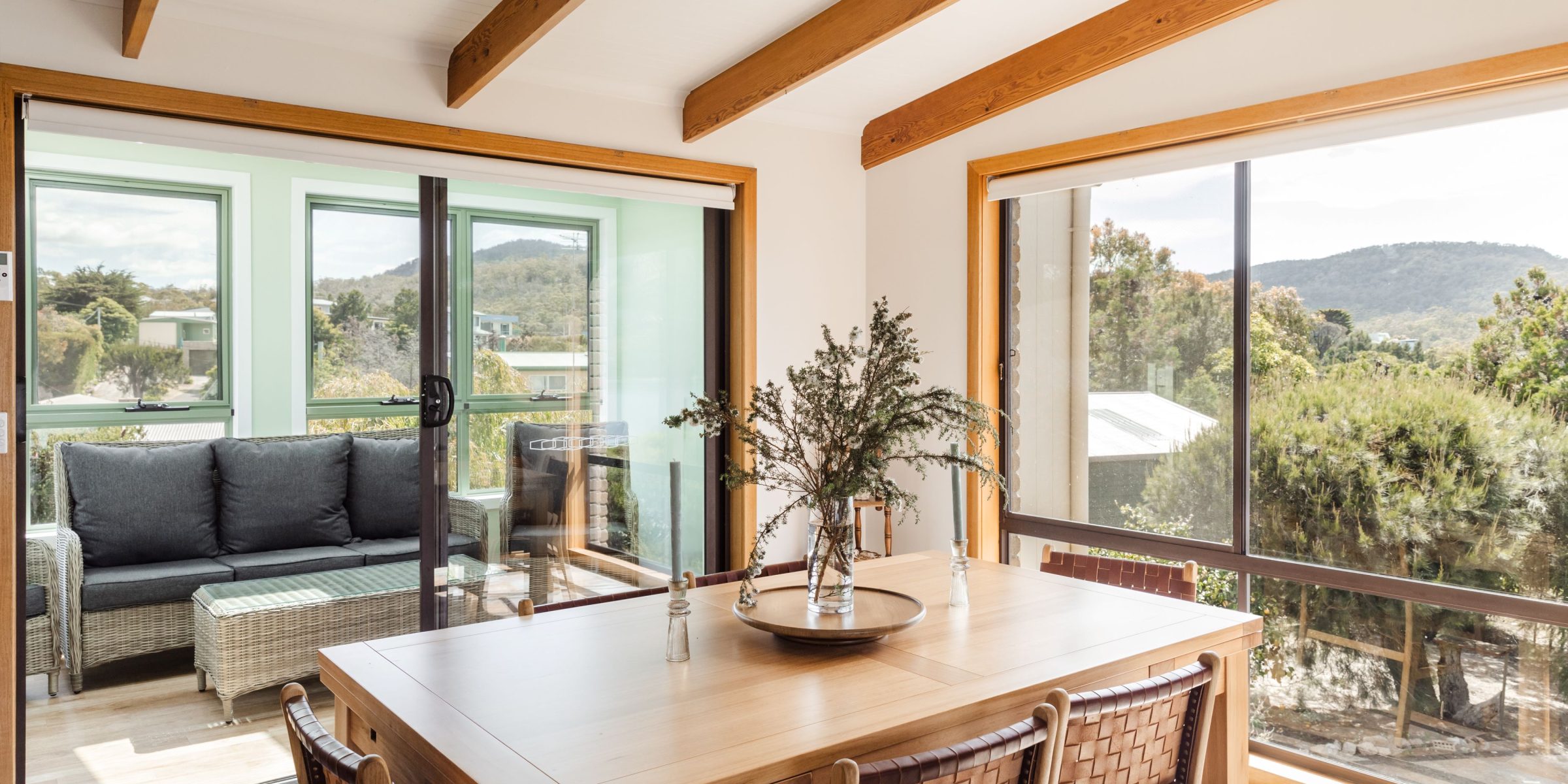 The open plan design of the kitchen flows into the lounge space where you could sit for days enjoying views of the ever-changing Hazard Mountains and Great Oyster Bay.